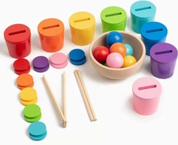 Dieses interaktive Montessori-Spielzeug bietet spielerisches Lernen für Kinder ab 3 Jahren. Kinder sortieren Kugeln und Holz-Münzen farblich in die Becher, probieren das Umfüllen mit Löffel, Pinzette und Essstäbchen und trainieren Geduld, Genauigkeit und Konzentration. Dank leuchtender Farben und verschiedener Werkzeuge entwickeln sie die taktile Sensibilität und das visuelle Wahrnehmen.
