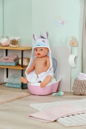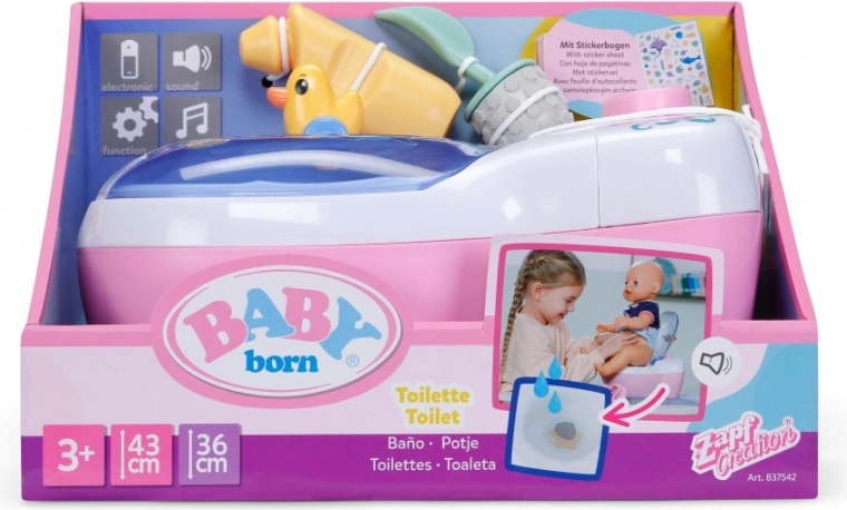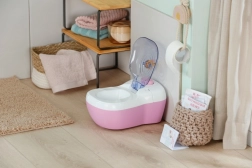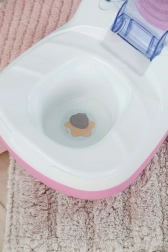 Die interaktive BABY born Toilette verwandelt die tägliche Pflege der Puppe in ein unterhaltsames Ritual. Sobald die Puppe auf dem Sitz Platz nimmt, ertönen realistische Plätschergeräusche, und wenn sie länger sitzen bleibt, starten eine witzige Melodie und anschließend das Spülgeräusch. Das motiviert Kinder zu einem spielerischen Training hygienischer Gewohnheiten.
