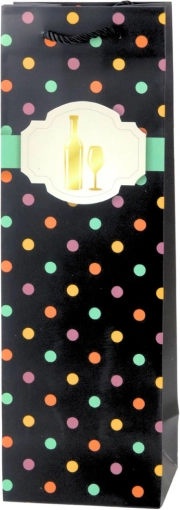 Die elegante Geschenktasche für Wein ist ideal, um eine Flasche Alkohol oder ein anderes schmales Geschenk stilvoll zu verpacken. Das klassische Punktedesign mit goldenem Motiv von Flasche und Glas wirkt feierlich und passt zu jedem Anlass – Geburtstag, Jubiläum oder Feiertage. Stabiles, hochwertiges Papier und ein robuster Kordelgriff sorgen für sicheren Transport.