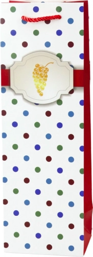 Dank der Maße von 35 × 12 × 9 cm ist die Tasche perfekt für Flaschen und andere hohe Geschenke geeignet. Erhältlich im Mustermix (weiß und schwarz mit bunten Punkten) mit dem Motiv Flasche und Glas oder Trauben. Verkauf einzeln; Motiv wird zufällig ausgewählt.