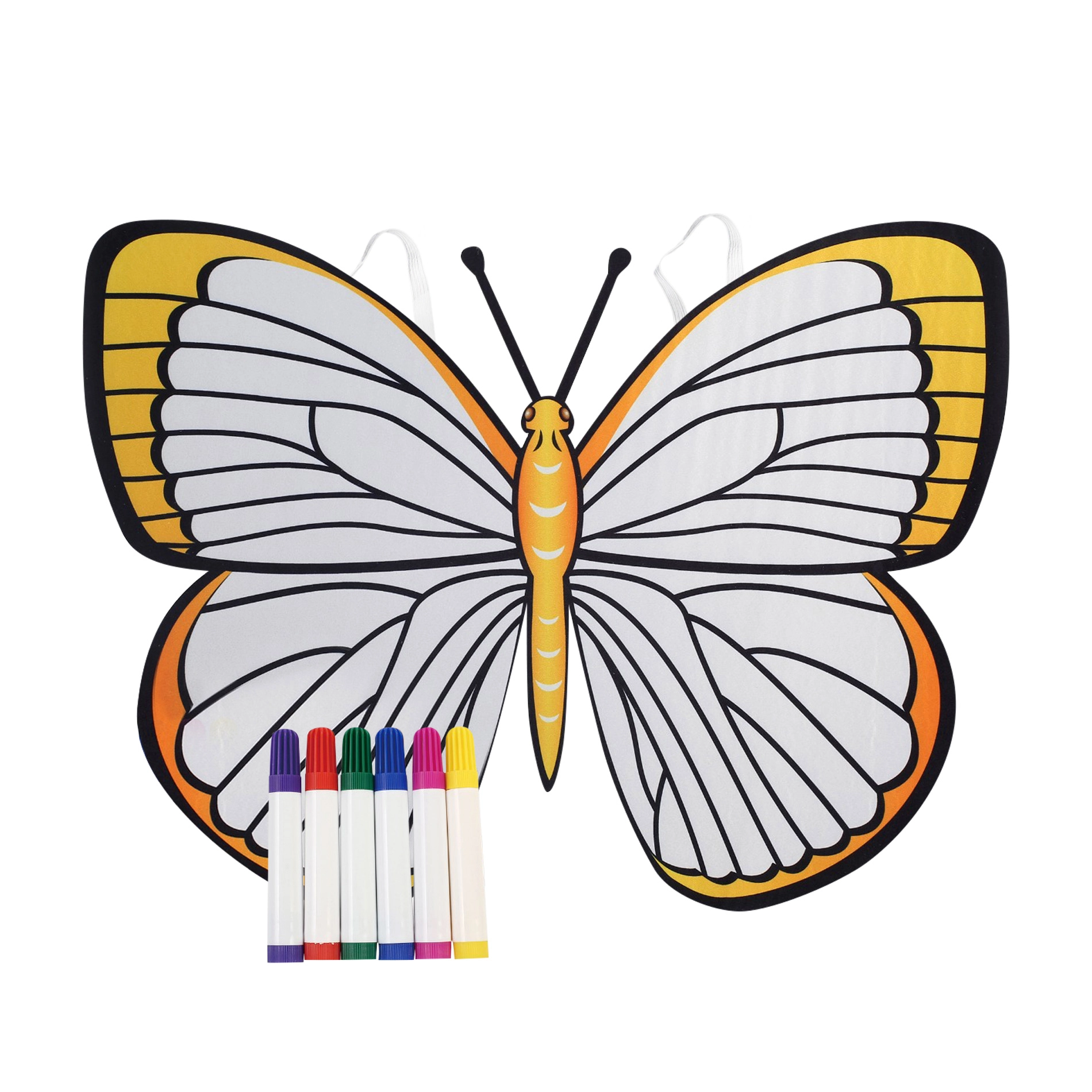 Verwandeln Sie jeden Nachmittag in ein märchenhaftes Abenteuer. Die gelben Schmetterlingsflügel zum Ausmalen ermöglichen es Kindern, die Hauptgestalter ihres eigenen Kostüms zu sein. Dank hochwertigem Textilmaterial und 6 beiliegenden Markern ist das Verzieren einfach und macht Spaß – und das Ergebnis ist einzigartig.