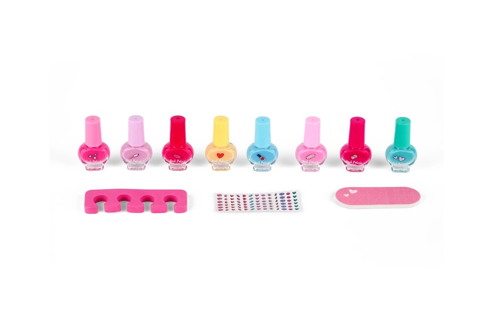 Der Setinhalt umfasst praktische Hilfsmittel zur Vorbereitung der Nägel (Feilen, Bürstchen) sowie Werkzeuge für die kreative Applikation (Pinsel in verschiedenen Größen, Applikatoren). Dank der mehrfarbigen Dekorationen lassen sich Looks leicht auf Outfit oder Saison abstimmen und den Nägeln ein strahlender Effekt verleihen.