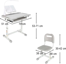 Dieses multifunktionale „mitwachsende“ Set aus Tisch und Stuhl ist ideal fürs Kinderzimmer für Schulkinder ab 3 Jahren. Dank der verstellbaren Höhe fördert es gesunde Sitzgewohnheiten und die richtige Ergonomie schon im frühen Alter. Die klappbare Tischplatte bis 55° erleichtert Lesen, Zeichnen und Schreiben, während die USB-LED-Lampe jederzeit für eine hochwertige Ausleuchtung der Arbeitsfläche sorgt.