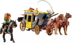 Werden Sie Kutscher der Postkutsche und schützen Sie die wertvolle Fracht vor dem maskierten Banditen. Dieses detailreiche PLAYMOBIL-Set bringt Action, Spannung und Humor – vom „Wanted“-Plakat bis zu Handschellen und Waffen für Filmszenen aus dem Wilden Westen. Das abnehmbare Dach gibt den Blick auf das reich ausgestattete Innere frei, während drei Pferde für die schnelle Flucht durch die Prärie sorgen.