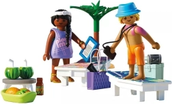 Auf in die Sonne mit dem PLAYMOBIL-Spielset, das eine entspannte Sommergeschichte erzählt. Das Duo genießt die Ruhe auf den Liegestühlen im Schatten der Palme, nippt an erfrischenden Getränken und knabbert saftiges Obst. Dank des UV-reaktiven Drucks auf der männlichen Figur erscheint bei echtem Sonnenlicht ein Sonnenbrand-Effekt – ein toller und lehrreicher Detailaspekt für Kinder.