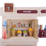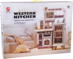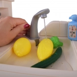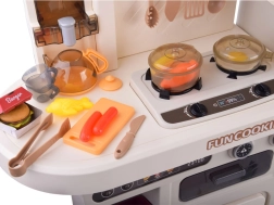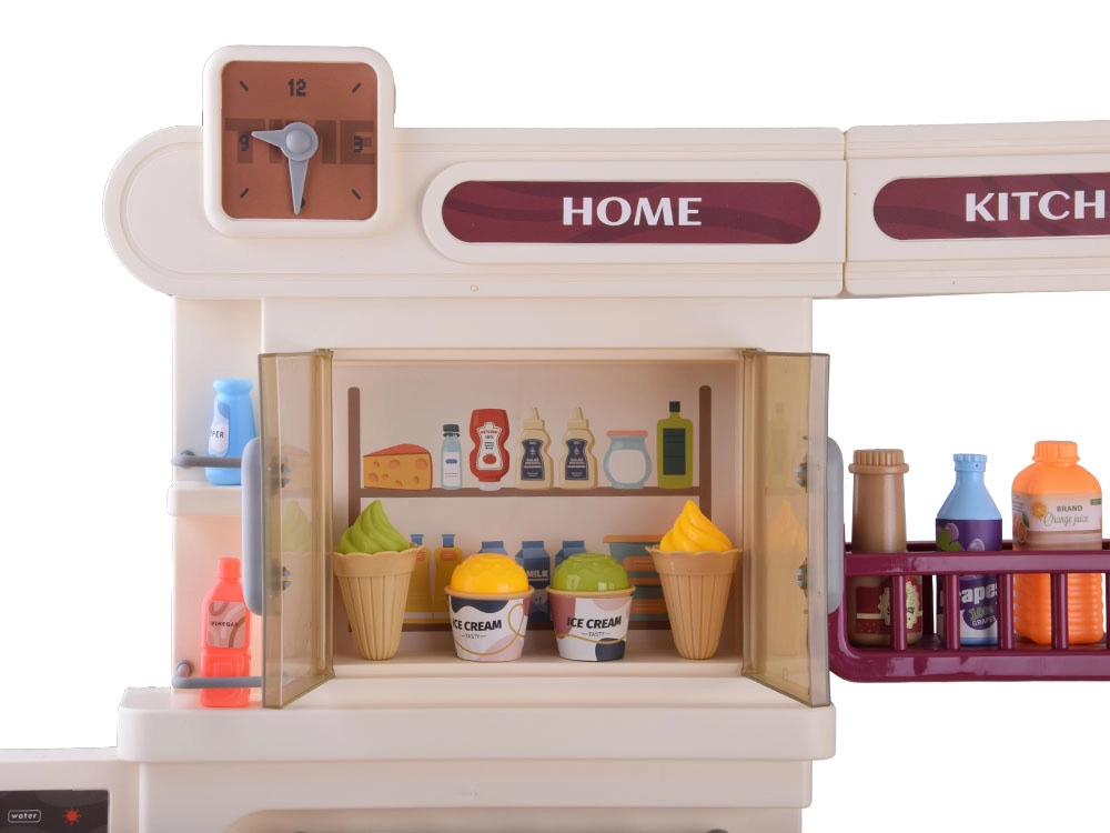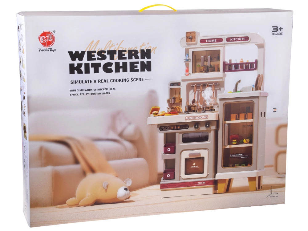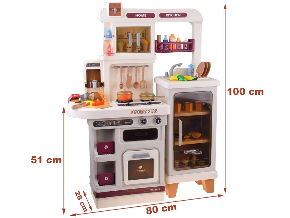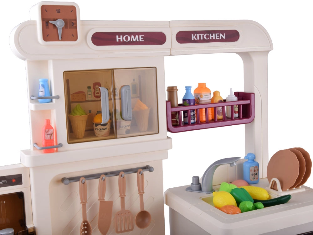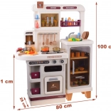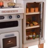 Diese geräumige interaktive Küche ermöglicht Kindern, Kochen, Backen und Abwaschen nachzuspielen. Dank des dampfenden Brenners mit Licht- und Kochgeräusch, dem öffnenden Ofen, Ablagen und Haken für Utensilien sowie dem Wasserspender wirkt das Spiel maximal realistisch und unterhaltsam.