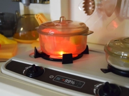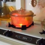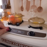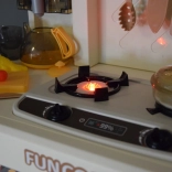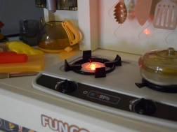 Der interaktive Brenner bietet zwei Modi: Kochgeräusch mit Licht oder Dampfeffekt mit Sound. Drehknöpfe und Bedienfeld verleihen dem Spiel einen realistischen Touch.