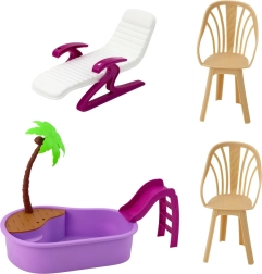 Pool mit Palme und Rutsche, Liege, Sonnenschirm, Tisch, Stühlchen, Getränkestand