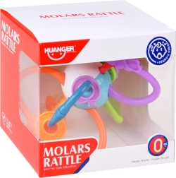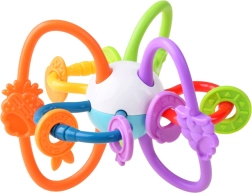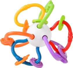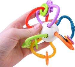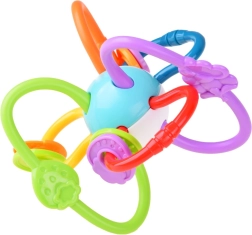 Dieser Beißring wurde aus hochwertigen, sicheren Materialien hergestellt, die für Babys geeignet sind. Dank der flexiblen, gedrehten Teile lässt er sich leicht greifen, massiert das Zahnfleisch und rasselt zugleich sanft, was das Hören fördert. Sanft verschiebbare, farbige Elemente laden zum Entdecken ein und trainieren die Feinmotorik.