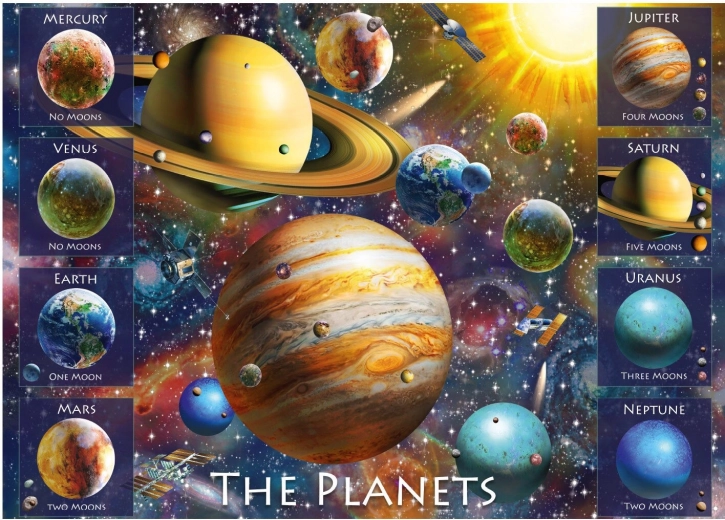 Dieses Puzzle mit Weltraum-Motiv bietet unterhaltsames und lehrreiches Puzzeln für Kinder und Erwachsene. Dank der 500 XL Teile ist die Handhabung einfach, die Teile greifen präzise ineinander, und das illustrierte Motiv der acht Planeten ist ein großartiges Thema für alle Astronomie-Fans.