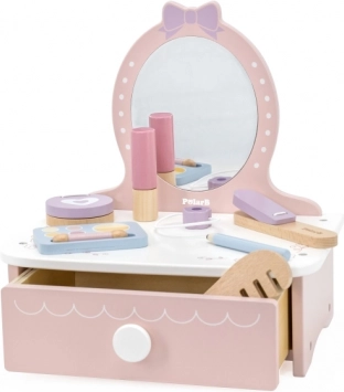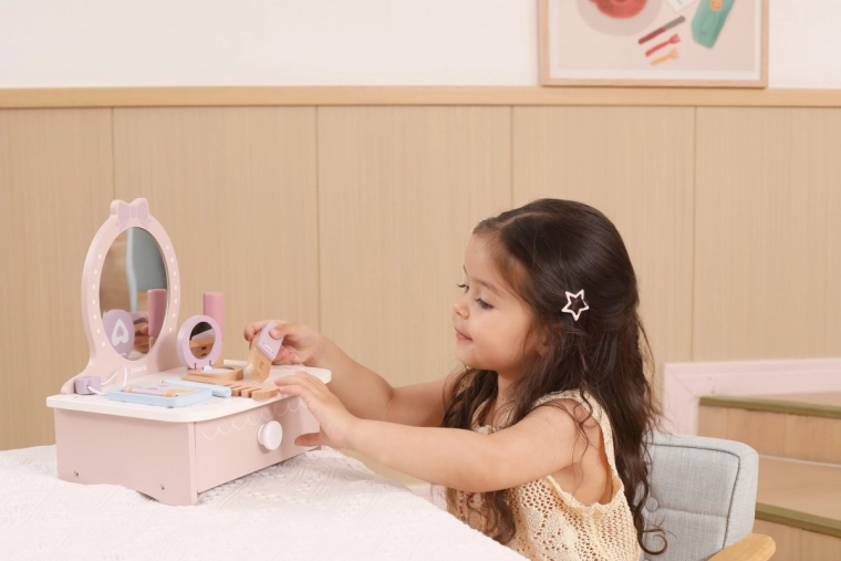 Ein stylischer Kinderschminktisch aus Holz bietet stundenlange kreative Unterhaltung. Enthält einen Tisch und sichere Holz-Accessoires wie Kamm, Lockenstab und Make-up. Ideal für Kinder ab 3 Jahren. Robuste Holzverarbeitung, reichhaltiges Zubehör und kompakte Abmessungen für eine einfache Platzierung im Kinderzimmer.