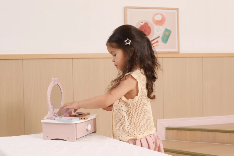Dieser niedliche Schminktisch aus Holz ist eine großartige Ergänzung für jedes Kinderzimmer. Er fördert Fantasie, soziales Spiel und Feinmotorik. Dank der stabilen Holzverarbeitung ist er sicher und langlebig für den täglichen Spielspaß.