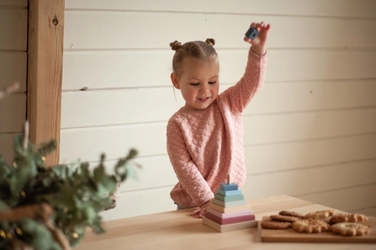 Pastellfarbene CUBIKA Holzpyramide, 9 Teile. Fördert Motorik und Logik, sichere wasserbasierte Farben, TÜV-Zertifizierung, EN 71. Ab 18 Monaten.