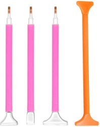 4 Applikatoren („Stifte“), Organizer für Steinchen, Andrückwalze, Pinzette, Kleber, Werkzeugtasche, 3 Schalen, Aufkleber zur Beschriftung der Fächer