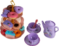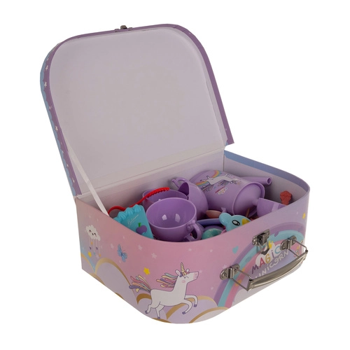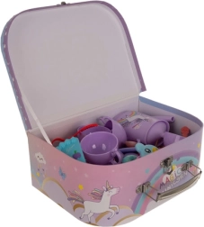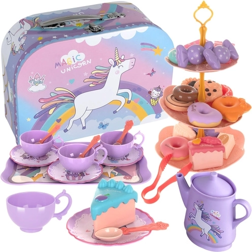 Ein entzückendes Teeset für Kinder in einem praktischen Koffer erfreut jeden kleinen Gastgeber. Enthält Teekanne, Tassen, Teller, Tablett, einen dreistöckigen Süßigkeitenständer und 21 Leckereien. Dank hochwertiger Materialien ist es bruch- und kratzfest, fördert kreatives Spiel und soziale Fähigkeiten und seine glatte Oberfläche lässt sich leicht reinigen.