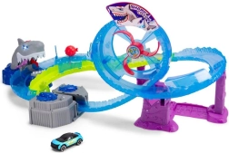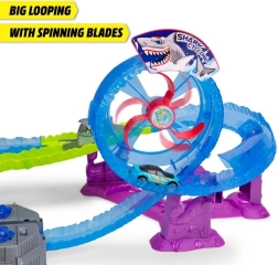 Genießen Sie eine adrenalingeladene Fahrt auf der motorisierten Autorennbahn mit Hai-Thema. Die Autos rasen mit Höchstgeschwindigkeit durch den Looping, passieren den Wassertunnel und können direkt beim riesigen Hai landen – der kann jedoch jederzeit seine Kiefer zuschnappen! Der integrierte Turbo-Booster katapultiert die Fahrzeuge auf maximale Geschwindigkeit und sorgt für ein intensives Rennerlebnis.