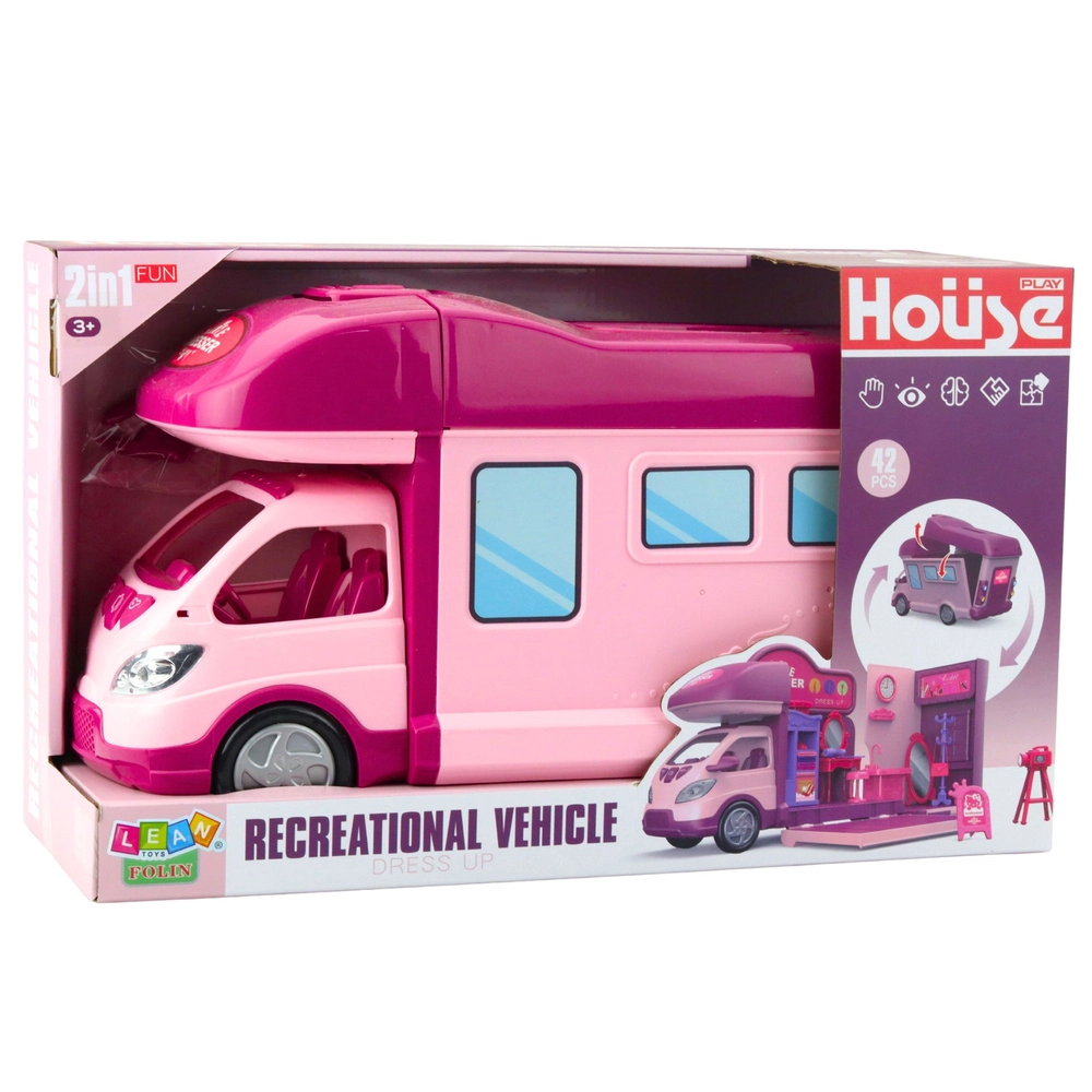 Der große rosa‑violette Camper verwandelt sich ausgeklappt in ein gemütliches Puppenhaus, das die Fantasie und kreatives Spielen anregt. Umfangreiches Zubehör ermöglicht eine variable Innengestaltung ganz nach den Vorstellungen des Kindes.