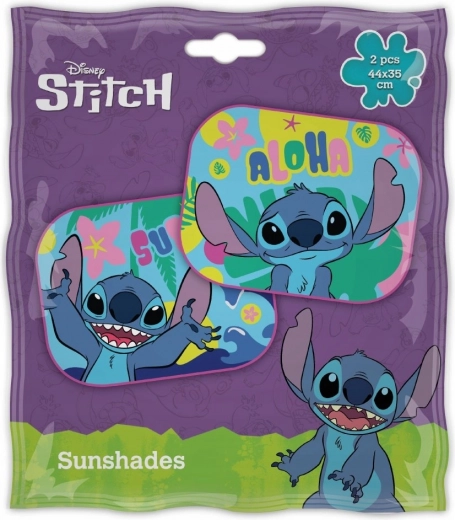 Set aus 2 Auto-Sonnenschutzblenden mit STITCH-Motiv. Einfache Montage mit Saugnäpfen, Schutz vor Sonne und weniger Aufheizung des Innenraums. Maße 44 × 35 cm.