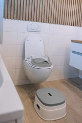 Zum Set gehört eine herausnehmbare Innenschale für eine einfache und schnelle Reinigung, ein abnehmbarer WC-Aufsatz für die Verwendung auf Standardtoiletten sowie ein praktischer Tritthocker mit seitlichen Griffmulden, der dem Kind hilft, das Waschbecken oder höhere Stellen zu erreichen.