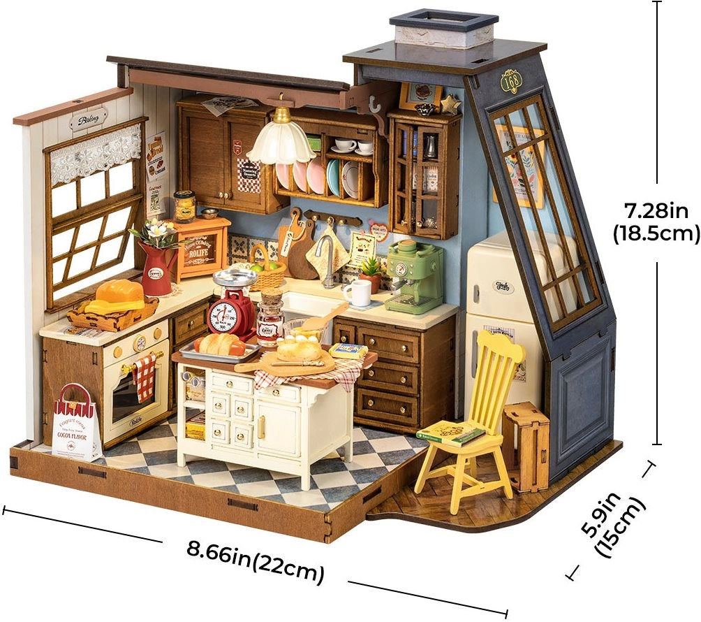 Dieses detailreich gestaltete Miniaturhaus bringt die Stimmung einer guten alten Küche zu Ihnen. Es enthält eingebaute Holzschränke, eine antike Waage, eine Kaffeemaschine, strahlend weiße Arbeitsplatten und einen retro gelben Stuhl. Große Fenster – eines mit europäischer schräger Verglasung und das andere mit Vordach und Gardine – verleihen der Szene Licht und Charme. Die LED-Beleuchtung unterstreicht zusätzlich die warme Note der heimeligen Atmosphäre.