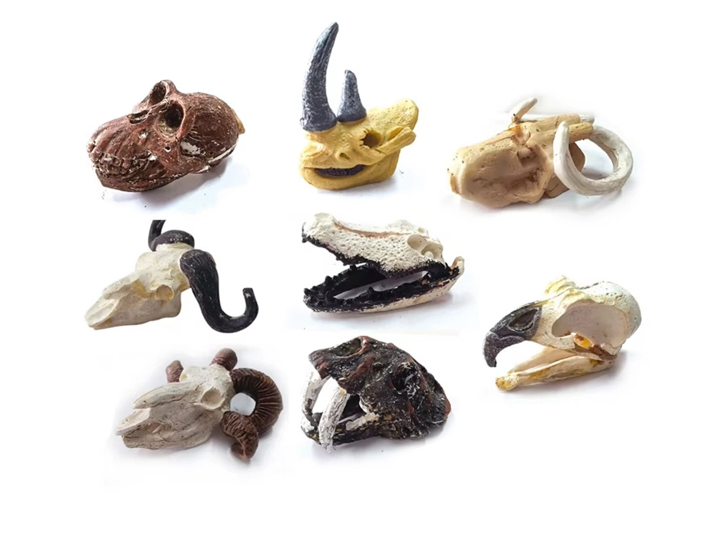 Jeder Block verbirgt ein anderes Schädelmodell, z. B. Mammut, Säbelzahntiger, Krokodil, Adler, Nashorn, Büffel, Schaf oder Primat. Ideal zum Sammeln und Lernen.