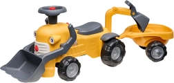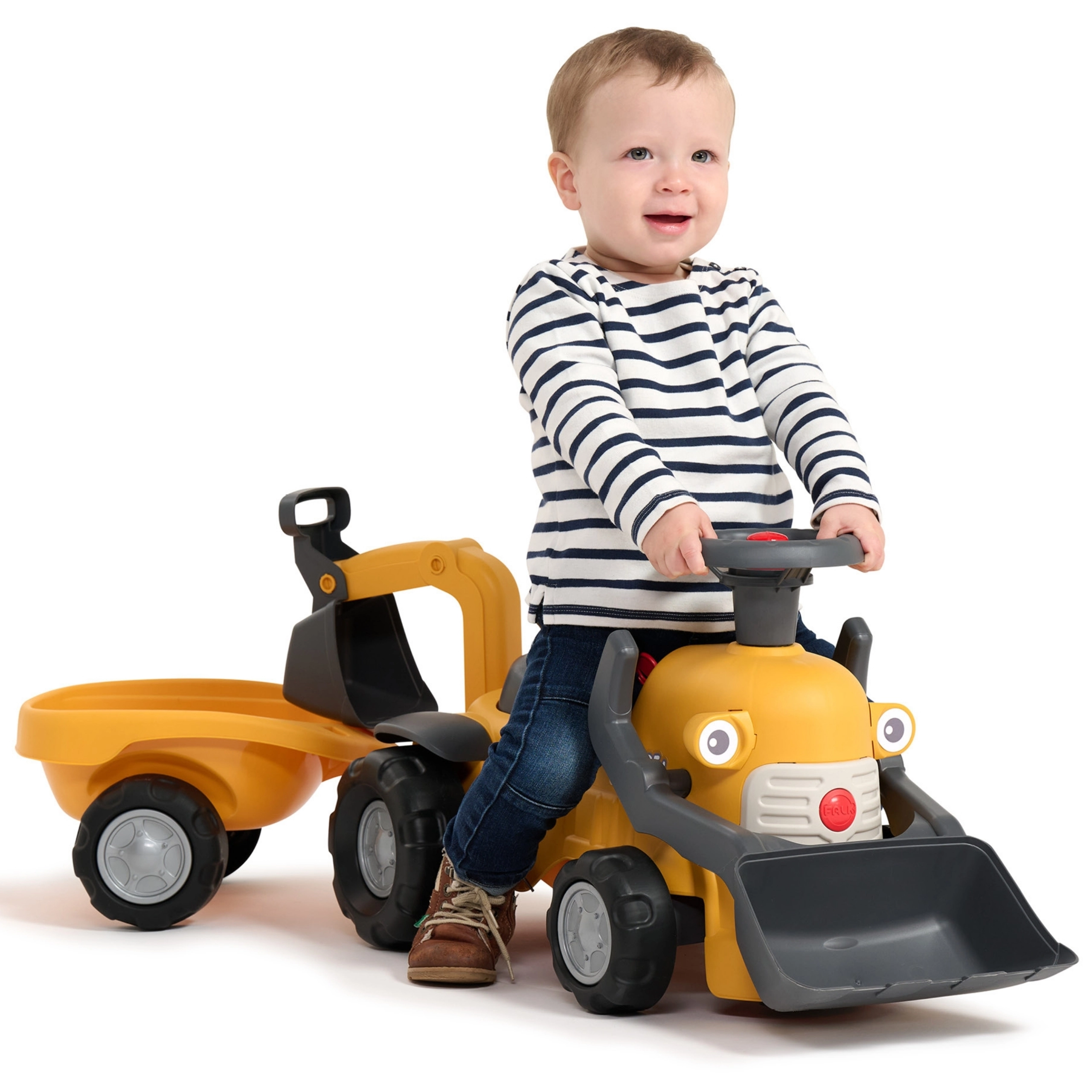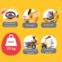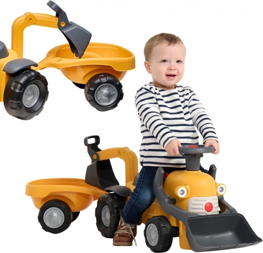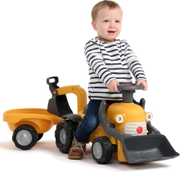 Entdecken Sie das erste kompakte Rutschfahrzeug mit echten Baggerfunktionen, das Bewegung und Rollenspiel verbindet. Kinder haben Spaß am Aufnehmen und Auskippen kleiner Gegenstände mit der vorderen Schaufel, während die hintere Schaufel perfekt zum Beladen des abnehmbaren Anhängers ist. Das drehbare Lenkrad mit Hupe, ein klickender Zündschlüssel und ein Staufach unter dem Sitz sorgen für stundenlangen kreativen Spielspaß.