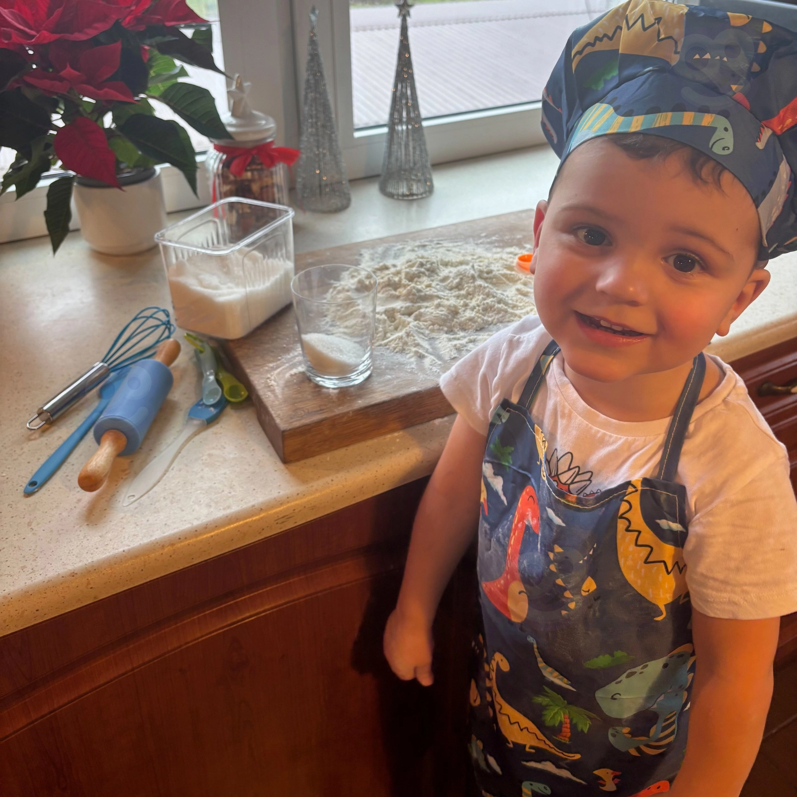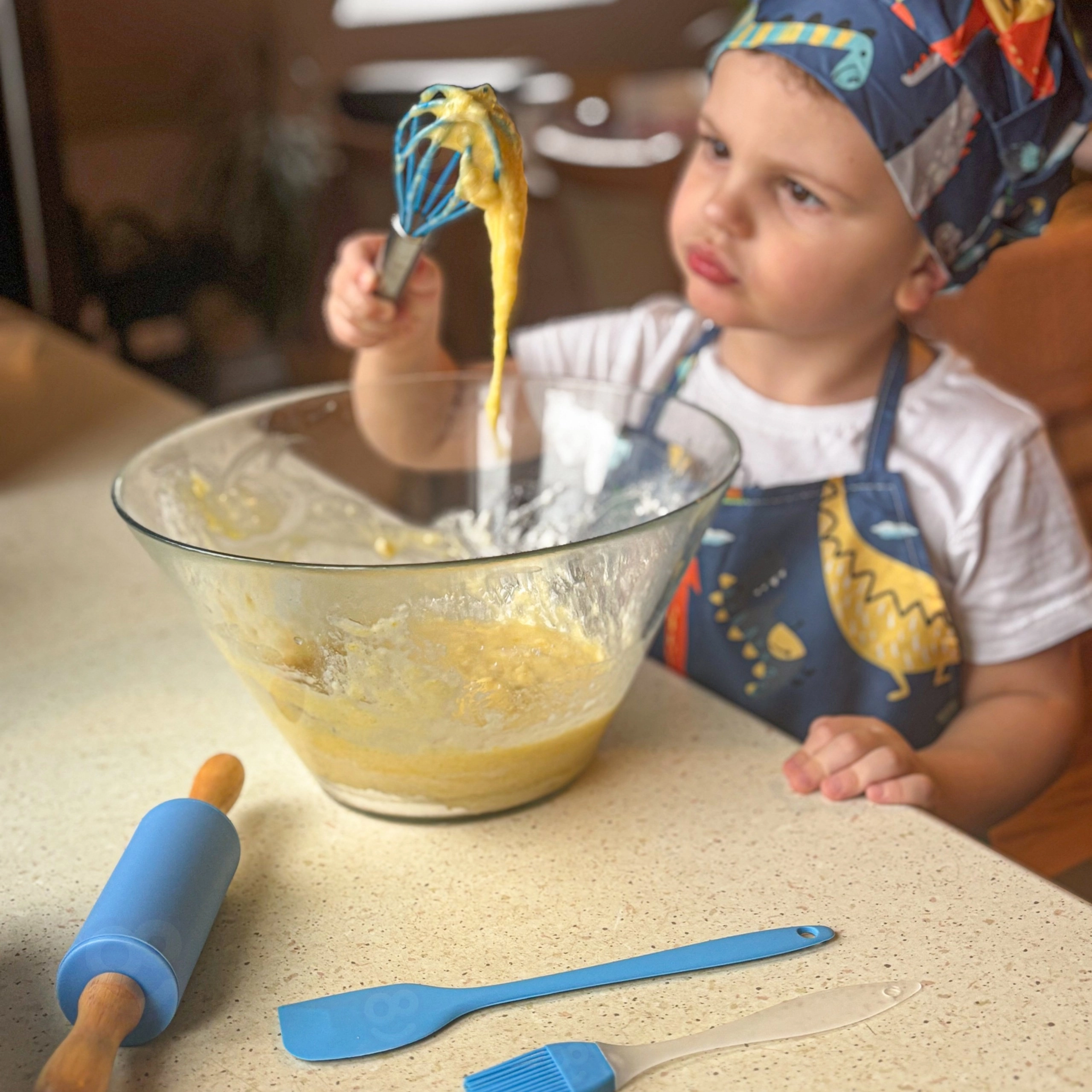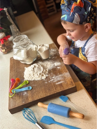 Im Set ist alles enthalten für Ausrollen, Rühren, Abmessen und Dekorieren – von Teigrolle und Schneebesen bis zu Silikonförmchen und Spritzbeuteln. Schürze und Mütze sind maschinenwaschbar, sodass der Spaß ohne Sorge um Schmutz weitergehen kann.
