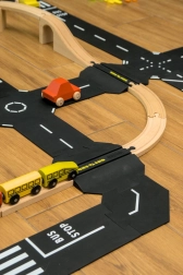 - Verbindung von Straße und Schiene – reibungsloser Übergang für Autos über Holzschienen (BRIO, MAXIM).