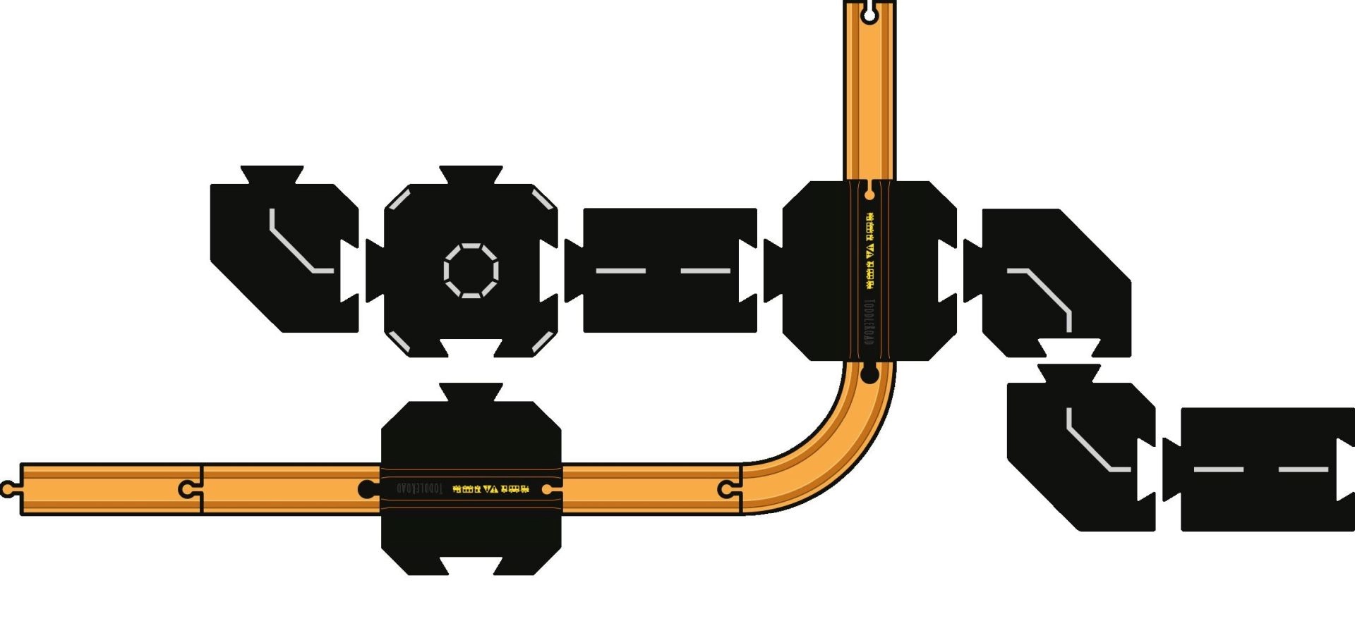 8 Silikonteile: 2 Eisenbahnübergänge, 2 kürzere gerade zweiseitige Straßen, 3 zweiseitige Kurven, 1 zweiseitiges Teil (Kreisverkehr / X‑Kreuzung)