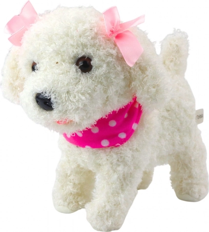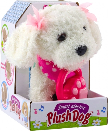 Dieser interaktive Hund aus angenehm weichem Plüsch eignet sich hervorragend zum Kuscheln und für Rollenspiele. Dank der mitgelieferten Pfoten-förmigen Leine können Sie den Hund auf „Spaziergänge“ führen, bei denen er läuft und Geräusche macht wie ein echtes Hundebaby. Ein rosa Halstuch mit Punkten und niedliche Schleifen verleihen dem Spielzeug ein charmantes Aussehen.