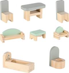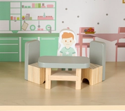 Mit dabei sind Bett, Schränkchen, Sitzgruppe, Tisch mit Stühlen sowie Badezimmereinrichtung. Zwei Holzfiguren regen Rollenspiel und Kreativität an.