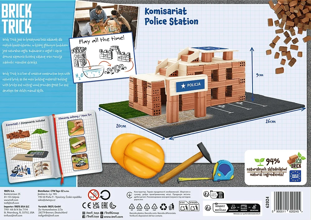 Bauen Sie eine detailreiche Polizeistation aus echten kleinen Tonziegeln und Holzelementen. Das Set bietet ein authentisches Bauerlebnis – Ziegel für Ziegel, Zuschneiden und Verkleben der Planken sowie die abschließende Verzierung mit beiliegenden Dekorationen und Papierfiguren. Das fertige Bauwerk lässt sich dank des im Wasser löslichen Klebers leicht anpassen und wieder zerlegen.