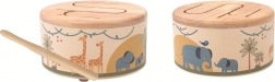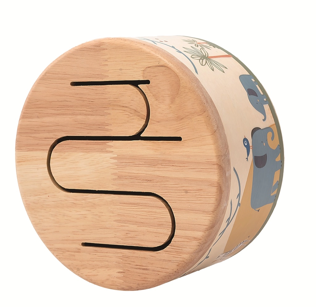 Die Holztrommel Safari ist für kleine Klangentdecker konzipiert. Die sorgfältige Verarbeitung, natürliche Materialien und verspielte Illustrationen machen sie zu einem beliebten Spielzeug, das die auditive Wahrnehmung und die Hand-Auge-Koordination fördert. Dank der kompakten Maße und des leichten Schlägels ist sie für Kinder besonders leicht zu handhaben.