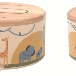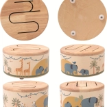 Illustrationen von Elefanten, Giraffen und Zebras regen die Fantasie an und machen die Trommel zu einem attraktiven Accessoire fürs Kinderzimmer.