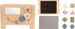 Unter der Sitzfläche befindet sich eine praktische Zeichentafel für erste Bilder und Notizen. An den Seiten beschäftigen eine bunte Auswahl an Spielelementen: ein Tier-Labyrinth zum Trainieren der Geduld, Einlegeformen zum Erkennen von Formen, Zahnräder zum Verstehen von Ursache und Wirkung, eine Uhr zum Erlernen der Zeit und ein Spiegel für spielerische Selbstwahrnehmung.