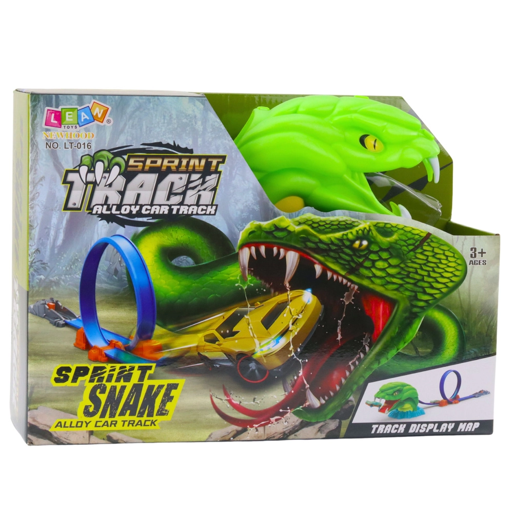 Erlebt Spannung auf jedem Zentimeter der Strecke. Die Rennbahn mit Schlangenhindernis kombiniert einen schnellen Start per Katapult, einen 360°-Looping und die finale Durchfahrt durch das geöffnete Maul der Schlange. Dank der einfachen Konstruktion und des batterielosen Betriebs ist der Spaß direkt nach dem Aufbau startklar.