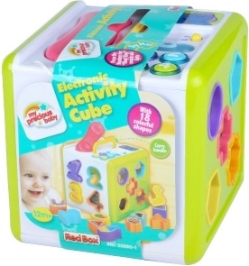 Der Würfel ist mit Licht- und Soundeffekten ausgestattet, die das Spielerlebnis verstärken und zur Entwicklung der sensorischen Wahrnehmung des Kindes beitragen. Außerdem ist er dank des praktischen Griffs leicht zu tragen.