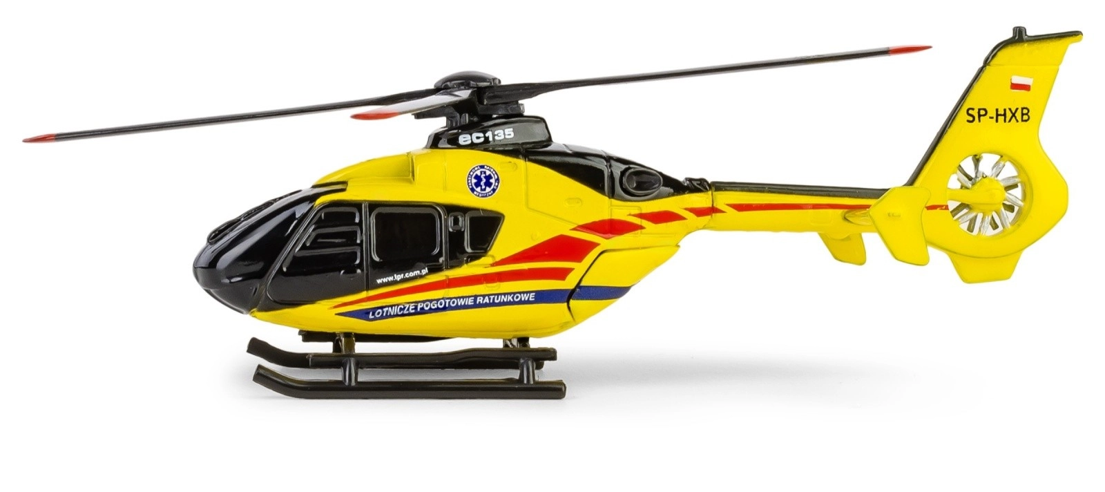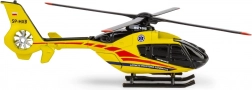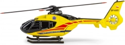Das Modell besteht aus Metall mit ergänzenden Kunststoffteilen, die die Details des Rumpfs, des Heckbereichs sowie der Rotoren betonen. Auf der Verpackung finden Sie Informationen über das Originalfluggerät und die Tätigkeit des Luftrettungsdienstes.
