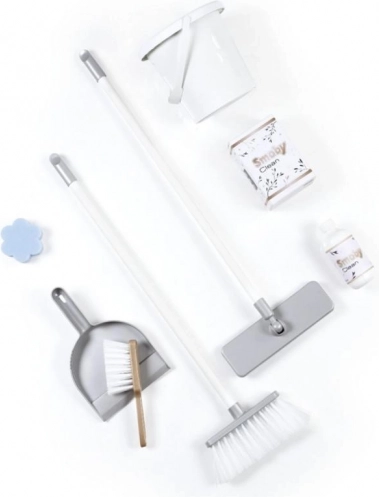 Enthalten sind Kehrschaufel und Handfeger, Wischmopp, Bürste, Eimer und Attrappen von Reinigungsmitteln – alles für Rollenspiele und die Förderung der Feinmotorik.