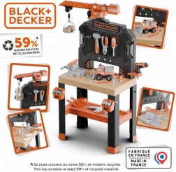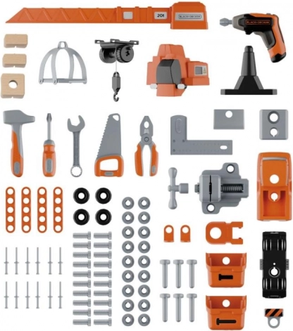 Enthalten ist ein Autobausatz, den kleine Mechaniker in wenigen Schritten zusammensetzen. Die Werkbank umfasst Hammer, Radschlüssel, Schraubendreher, Maul-/Gabelschlüssel, Zange, Säge, große Klemme und eine Schieblehre sowie Schrauben, Muttern, Nägel und Verbindungselemente. Kompatibel und erweiterbar mit allen BLACK+DECKER-Werkzeugen der Marke Smoby.