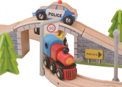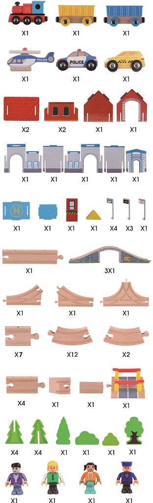 Diese detailreich gestaltete Eisenbahn bietet eine komplette Welt auf Schienen: Lokomotive mit Waggons, Autos, Figuren, Polizeistation, Landeplatz, Bäume und Verkehrsschilder. Kinder können Fracht verladen, über die erhöhte Brücke fahren, am Bahnhof halten und den Bahnübergang mit Schranken sicher passieren. Jede Fahrt wird zu einer neuen Geschichte und fördert Logik, Hand-Auge-Koordination und Kommunikation beim gemeinsamen Spiel.