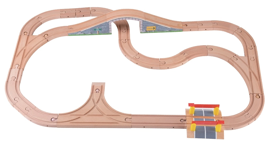 Verschiedene Schienenformen mit Brücke, Kurven und Kreuzungen halten die Aufmerksamkeit der Kinder und fördern räumliches Vorstellungsvermögen sowie Routenplanung.