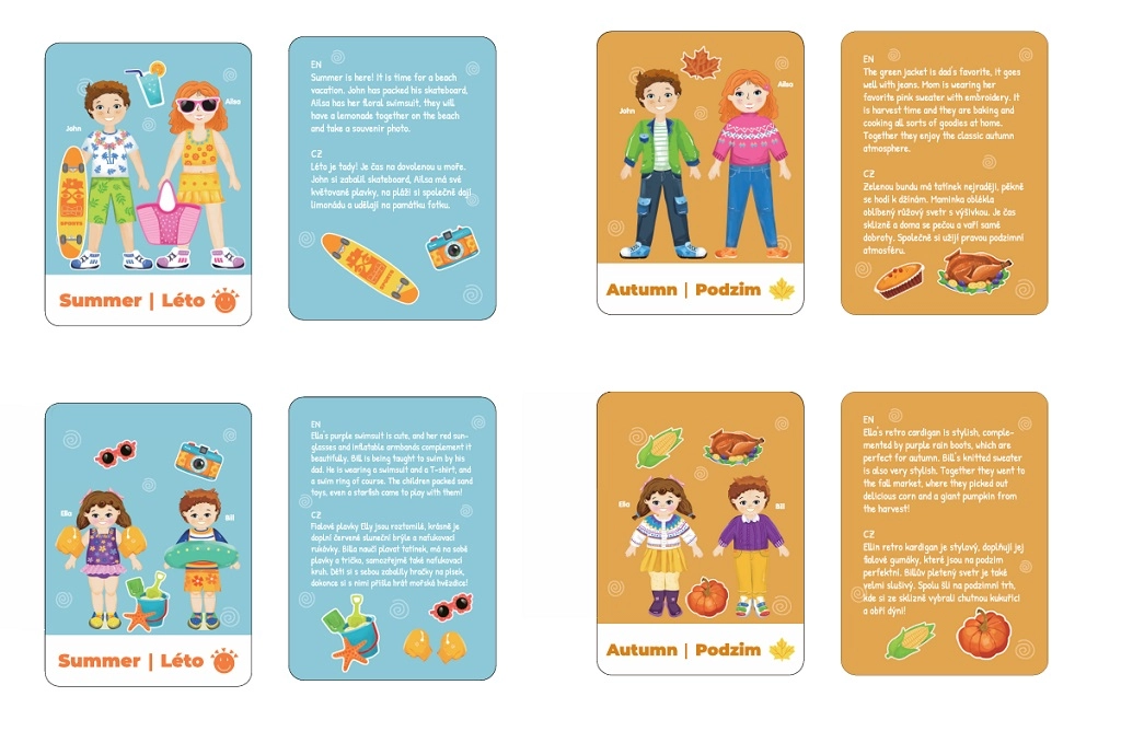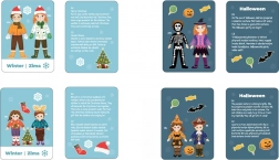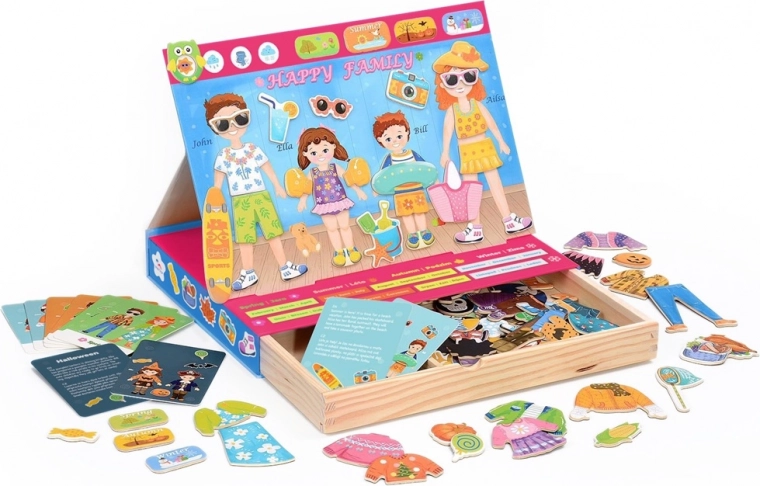 Das magnetische Ankleidespiel Familie ist ein kreatives Set, in dem Kinder Outfits für Mama, Papa, Tochter und Sohn entwerfen. Dank der großen Auswahl an Kleidung und Accessoires können sie Looks für Sommer, Herbst, Winter und Frühling gestalten und lustige Aufgaben auf thematischen Karten lösen. Die praktische magnetische Holzbox mit drehbarer Tafel dient als Spielfläche und Aufbewahrung, sodass das Spiel jederzeit mitgenommen werden kann.