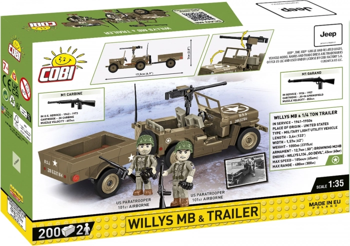 Der legendäre Geländewagen aus dem Zweiten Weltkrieg erwacht im COBI-Bauset zum Leben: Jeep WILLYS MB mit Anhänger. Das Modell besticht durch authentische Formen, militärische Farbgebung und eine Reihe von Zubehörteilen, darunter ein drehbares Maschinengewehr, Werkzeuge und Waffen für die Figuren. Dank hochwertiger Bausteine ist das Modell stabil und eignet sich sowohl für intensives Spielen als auch zur Präsentation in der Vitrine.