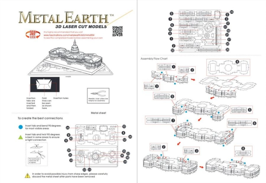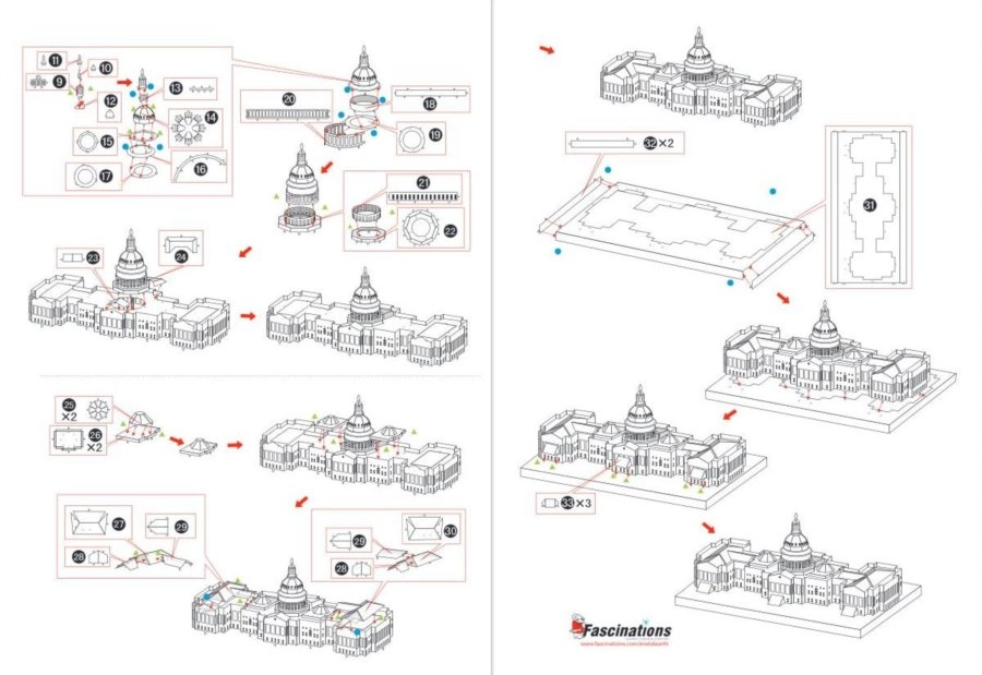 Das 3D-Puzzle METAL EARTH überzeugt durch hochwertige Verarbeitung und originalgetreue Details. Aus zwei Stahlblechen im Format 11 × 11 cm separieren Sie die Teile und verbinden sie mithilfe von Laschen und Biegungen zu einem beeindruckenden Modell des Kapitols. Das Ergebnis ist ein elegantes, metallisch glänzendes Exponat, das Sammler wie auch Architekturliebhaber begeistert.