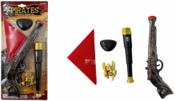 • Komplette Piratenausstattung – Steinschlosspistole, Fernrohr, Tuch, Anstecker, Augenklappe.