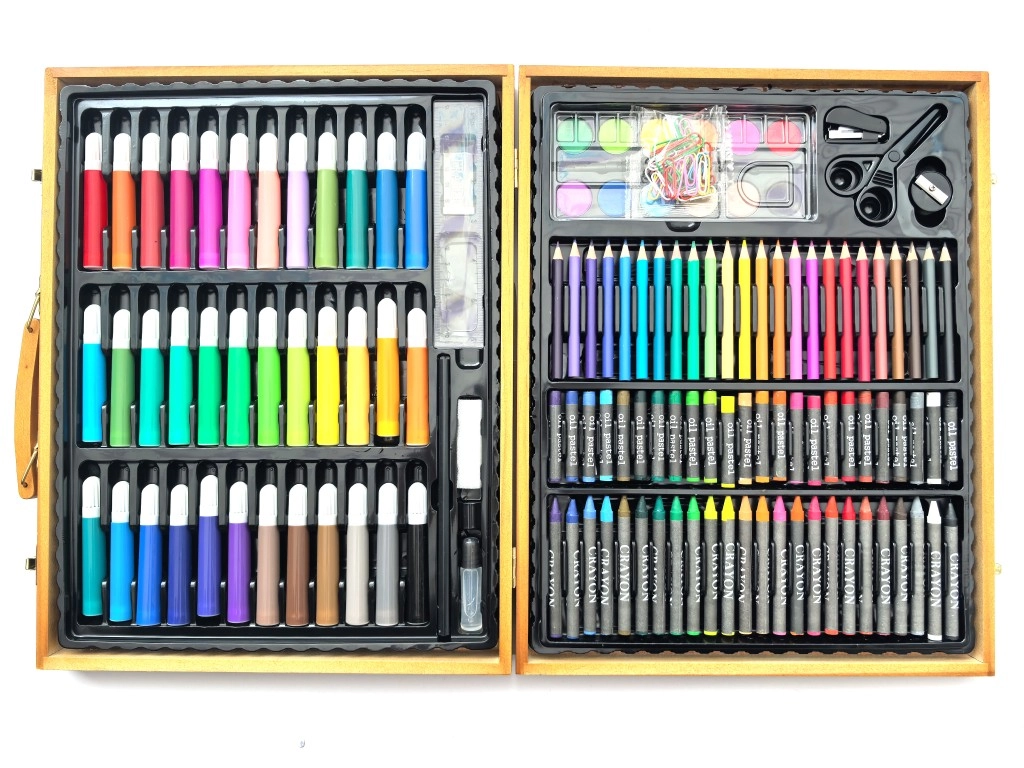 Dieser reichhaltig ausgestattete kreative Holzkoffer bietet alles, was Sie zur Förderung von Fantasie und künstlerischen Fähigkeiten benötigen. Dank der übersichtlichen Aufbewahrung ist jedes Werkzeug stets griffbereit und der Koffer lässt sich leicht transportieren.