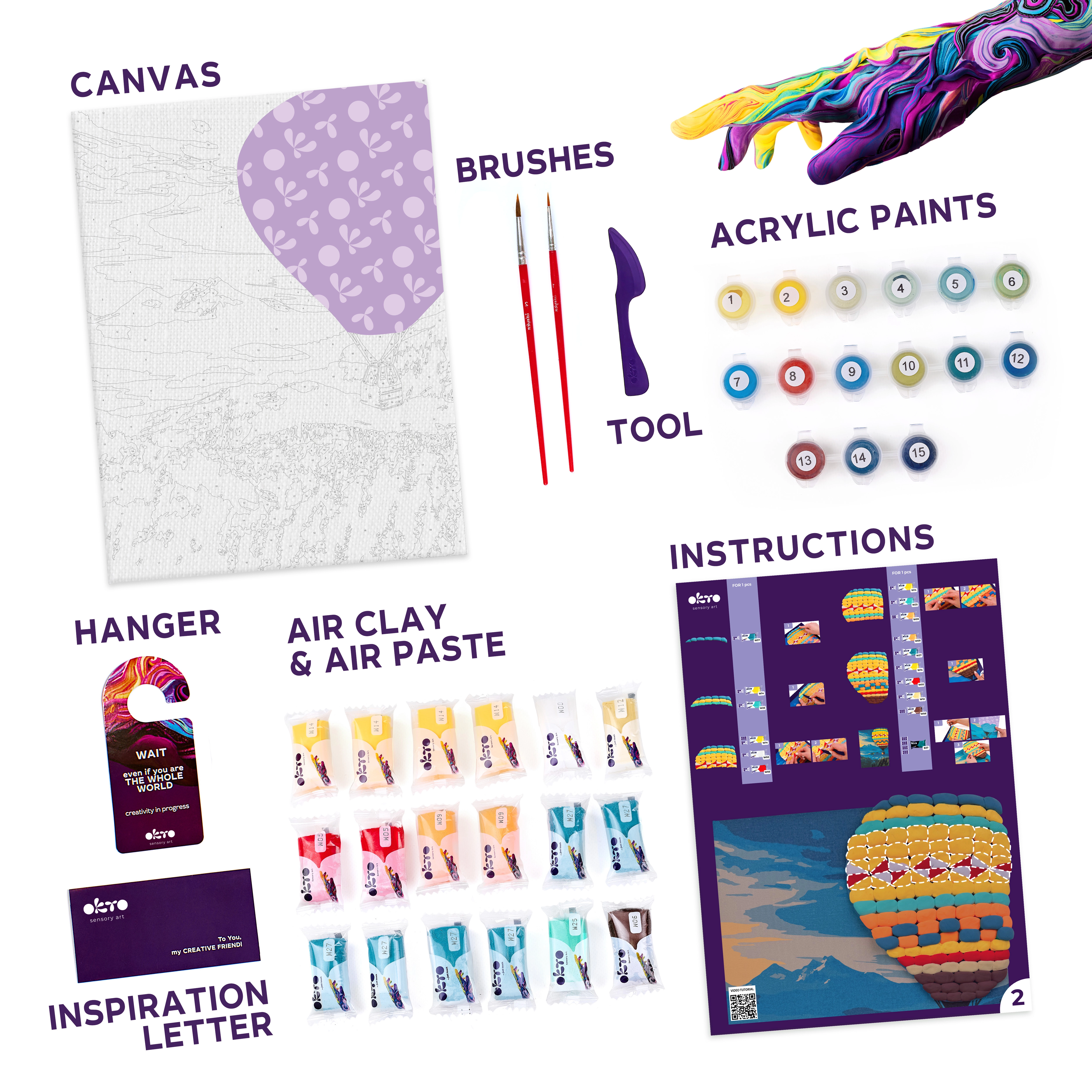 Alles Nötige ist im Set enthalten: hochwertige Leinwand mit vorgedruckter Vorlage, selbsthärtende Modelliermasse für plastische Teile des Ballons, Farben und Pinsel, ein praktisches Modellierwerkzeug sowie eine bebilderte Schritt‑für‑Schritt‑Anleitung. Dank klar gekennzeichneter Zahlen ist der Ablauf auch für leicht Fortgeschrittene intuitiv.