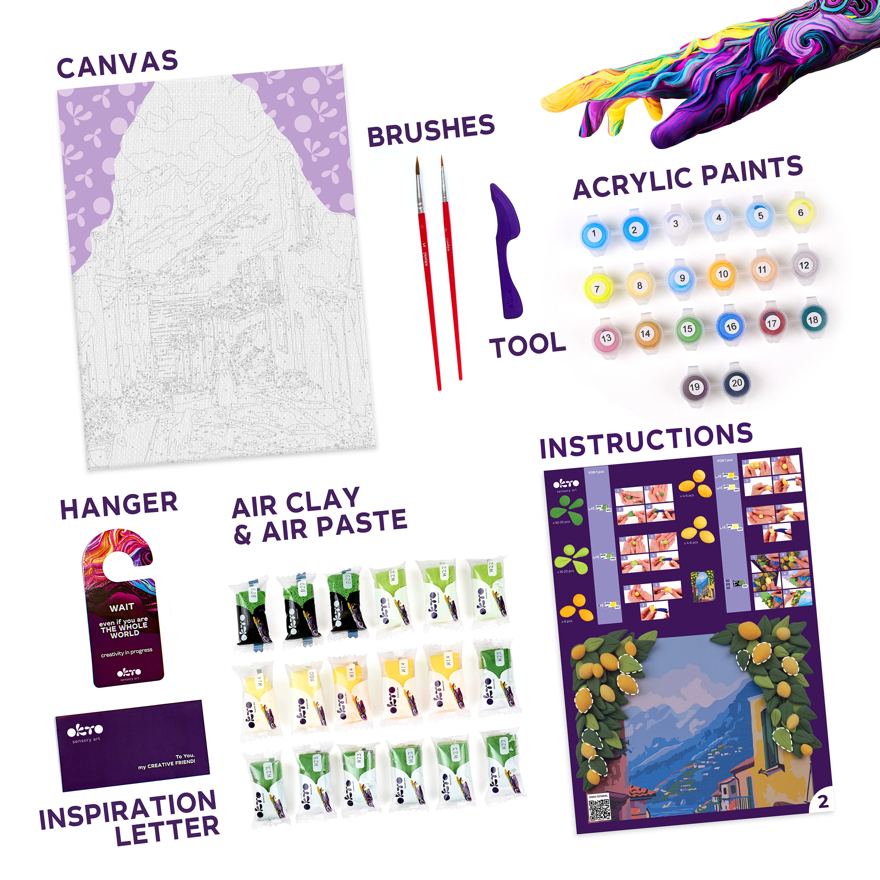 Im Paket ist alles enthalten, was Sie zum Gestalten brauchen – vom vorgedruckten Leinwandtuch über Farben bis hin zu Modelliermasse und Werkzeugen. Der Ablauf ist einfach und auch für absolute Anfänger gut geeignet.