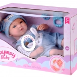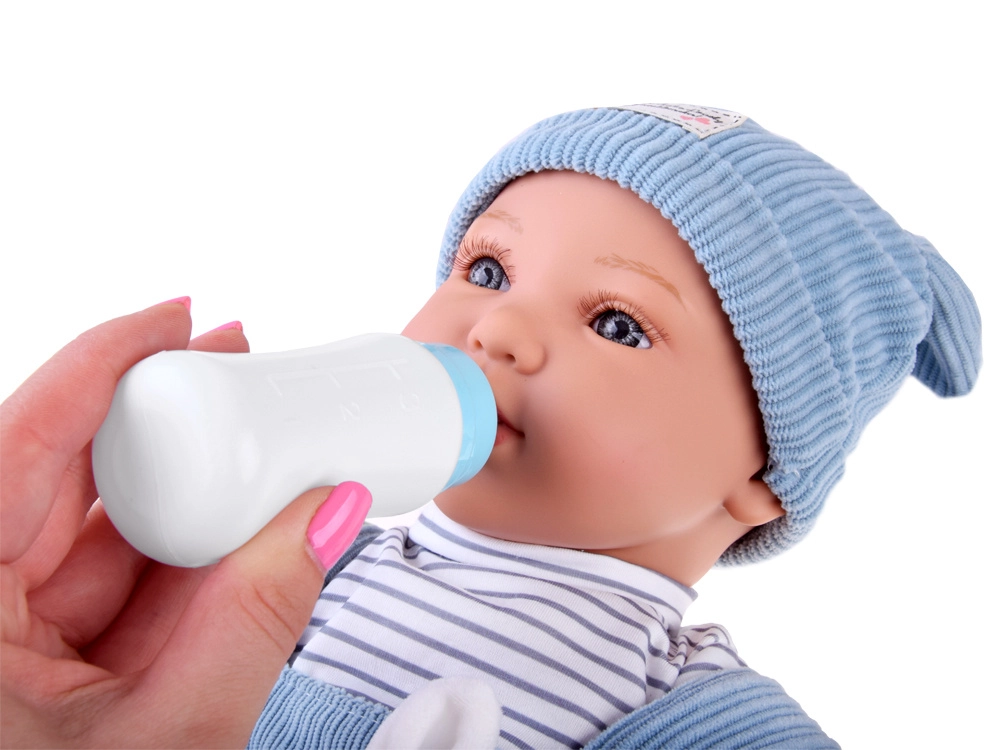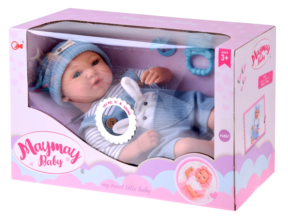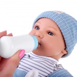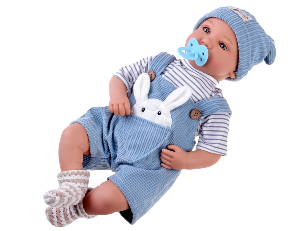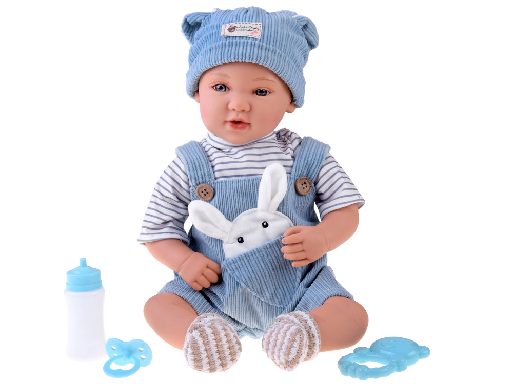 Niedliches interaktives Baby mit realistischen Details und weichem Bäuchlein sorgt für stundenlangen kreativen Spielspaß. Dank Soundmodul gibt es verschiedene Babygeräusche von sich, enthalten sind eine Flasche, ein Schnuller und eine Rassel. Das Outfit besteht aus einer weichen blauen Cordlatzhose mit einem Häschen in der Tasche, einem gestreiften T-Shirt, Socken und einer Mütze.